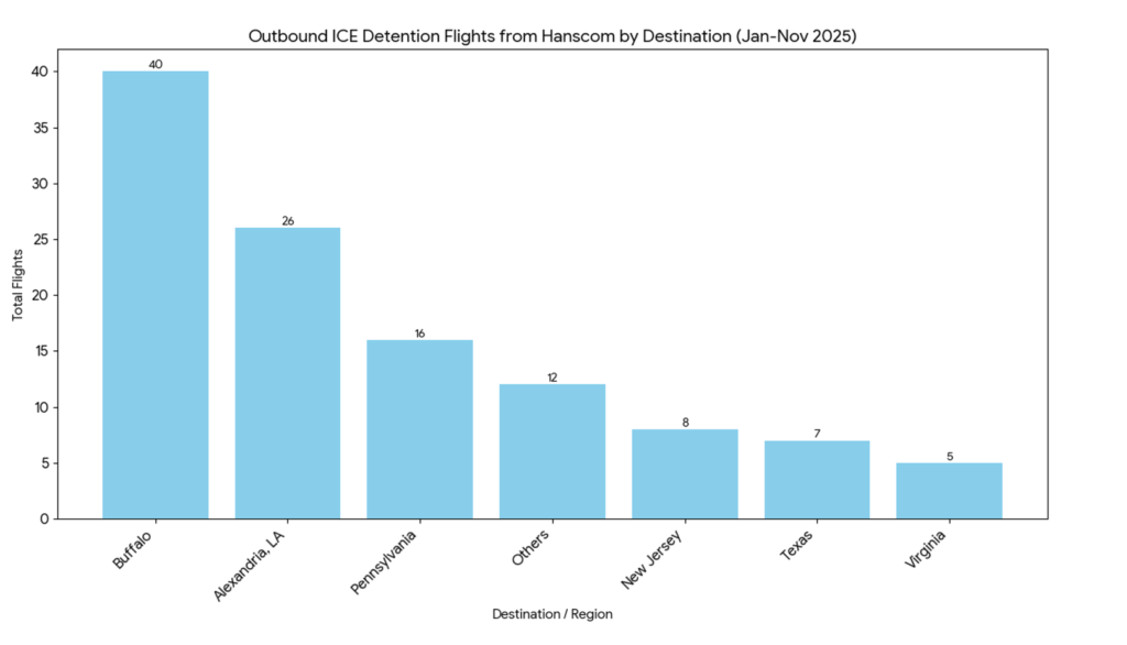 Dec 10, 2025 – A new record of ICE flights from Hanscom Field, prepared by Human Rights First, suggests that over 6,000 individuals were flown out of Hanscom Field to U.S. prisons and/or unknown international destinations between January and November 2025.