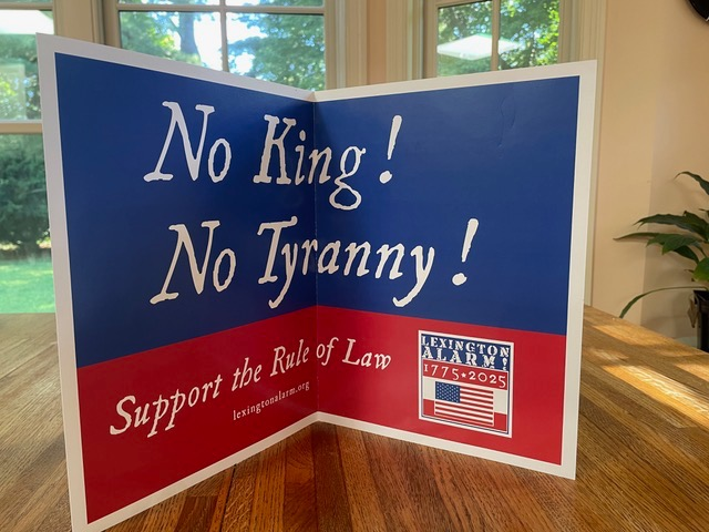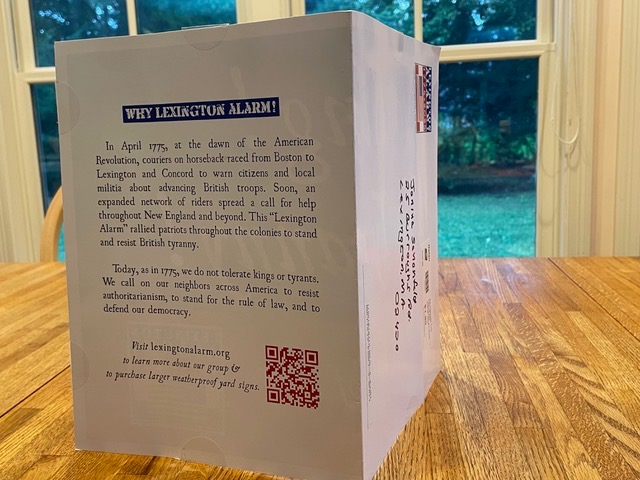 Innovative Lexington Alarm 12″x18″ window sign. Display one in a window. Bring one to a protest, or mail some to friends and family. Each 12″x18 sign also folds into a 9″x12″ first class mail piece!
